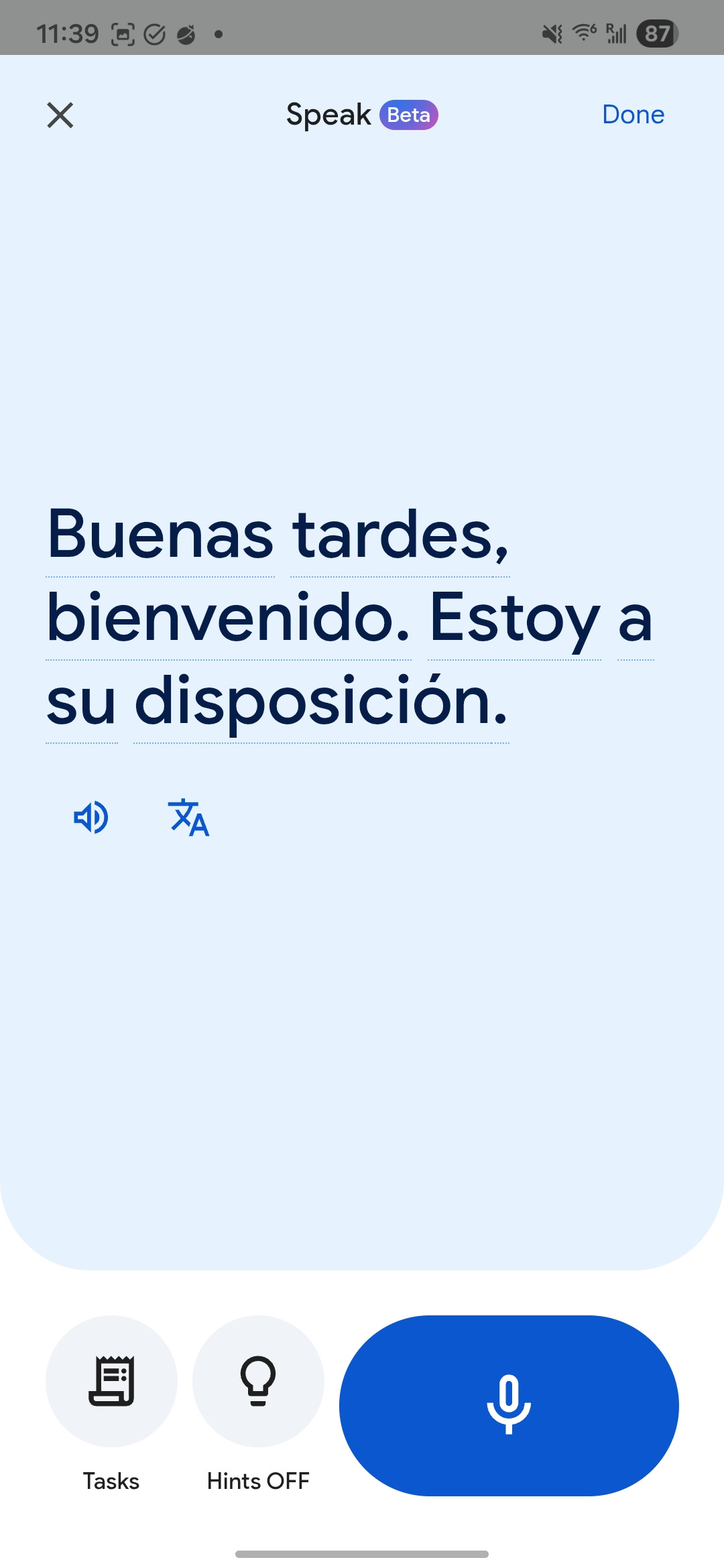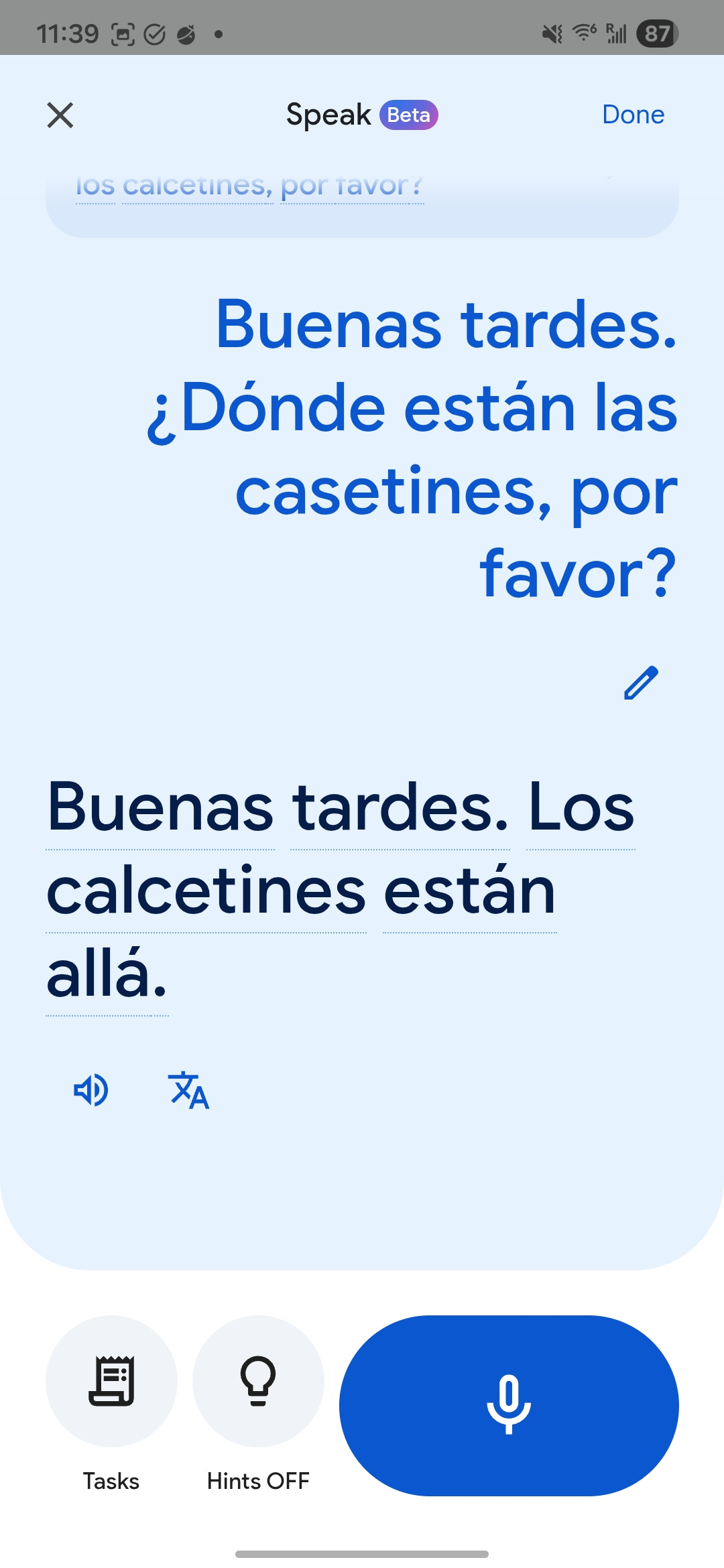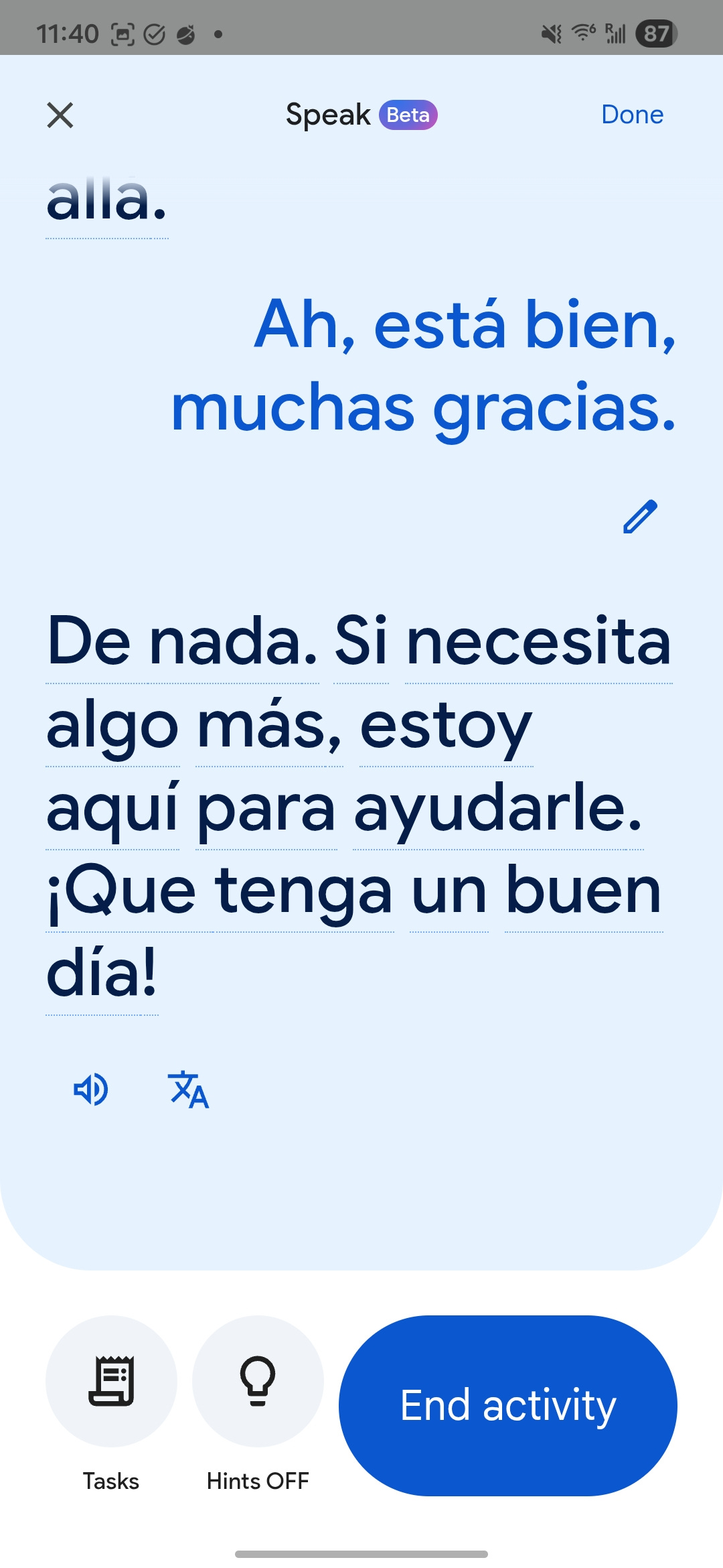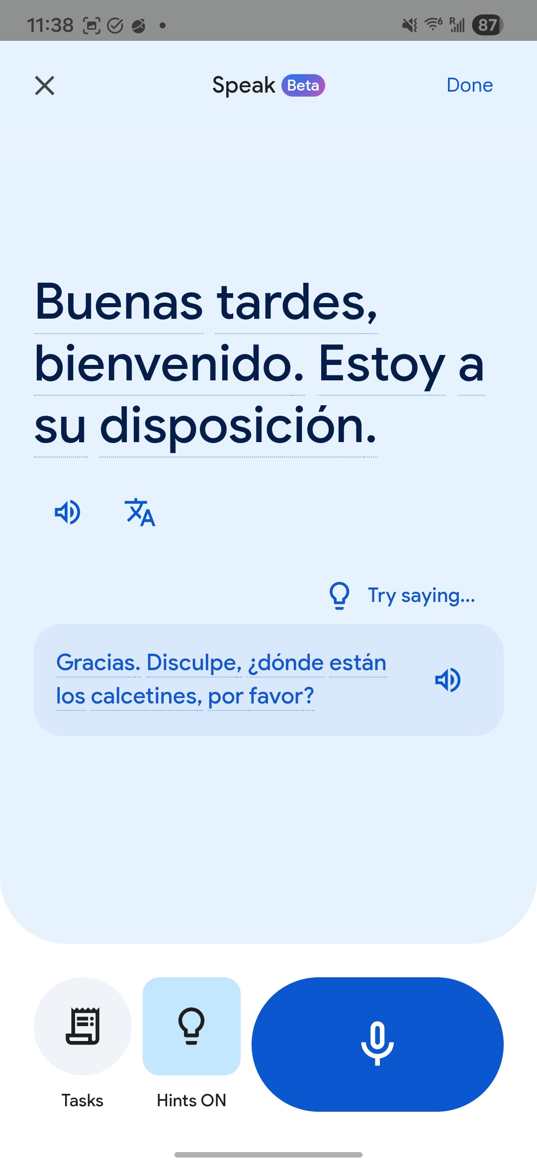 You can choose to have hints, which give you sentences to read out loud, or you can turn the hints off and manage the conversation on your own.