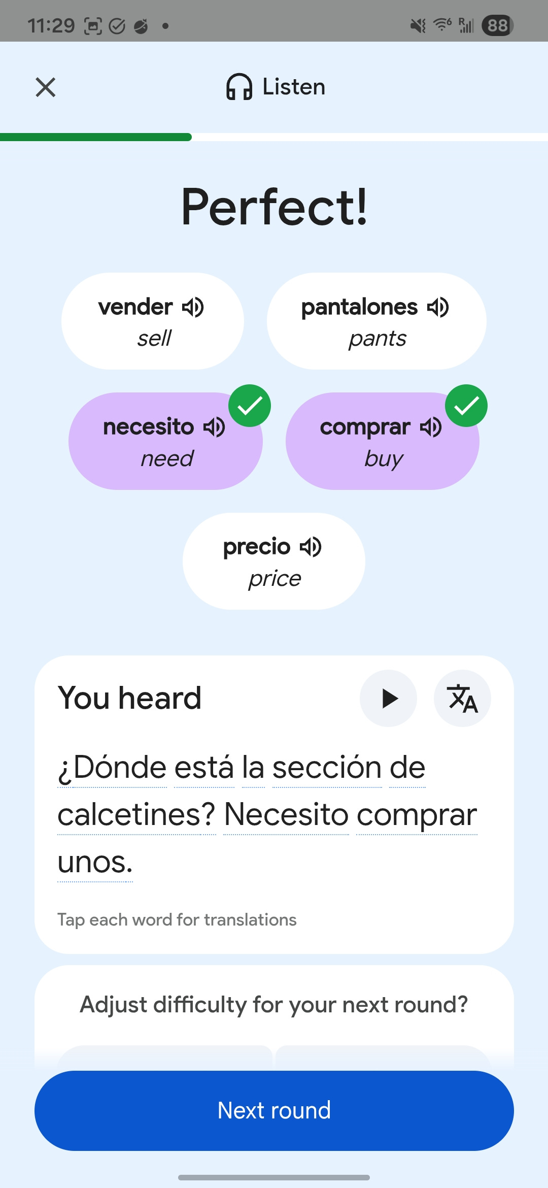You can listen at full speed or 0.8x and then choose the English translations of the Spanish words you heard in the audio.