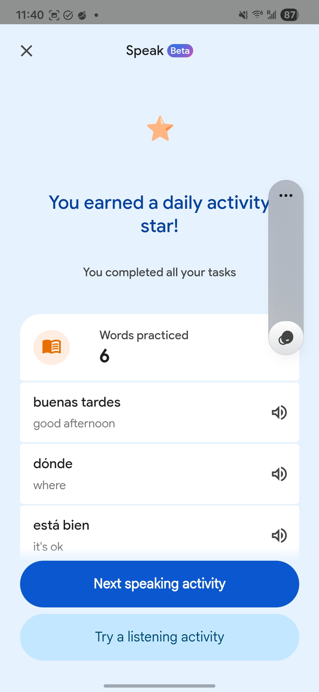 Practice isnāt heavily gamified like Duolingo, but it encourages you to do three daily activities, either listening, speaking, or both, and it keeps a running total of the number of words youāve practiced.