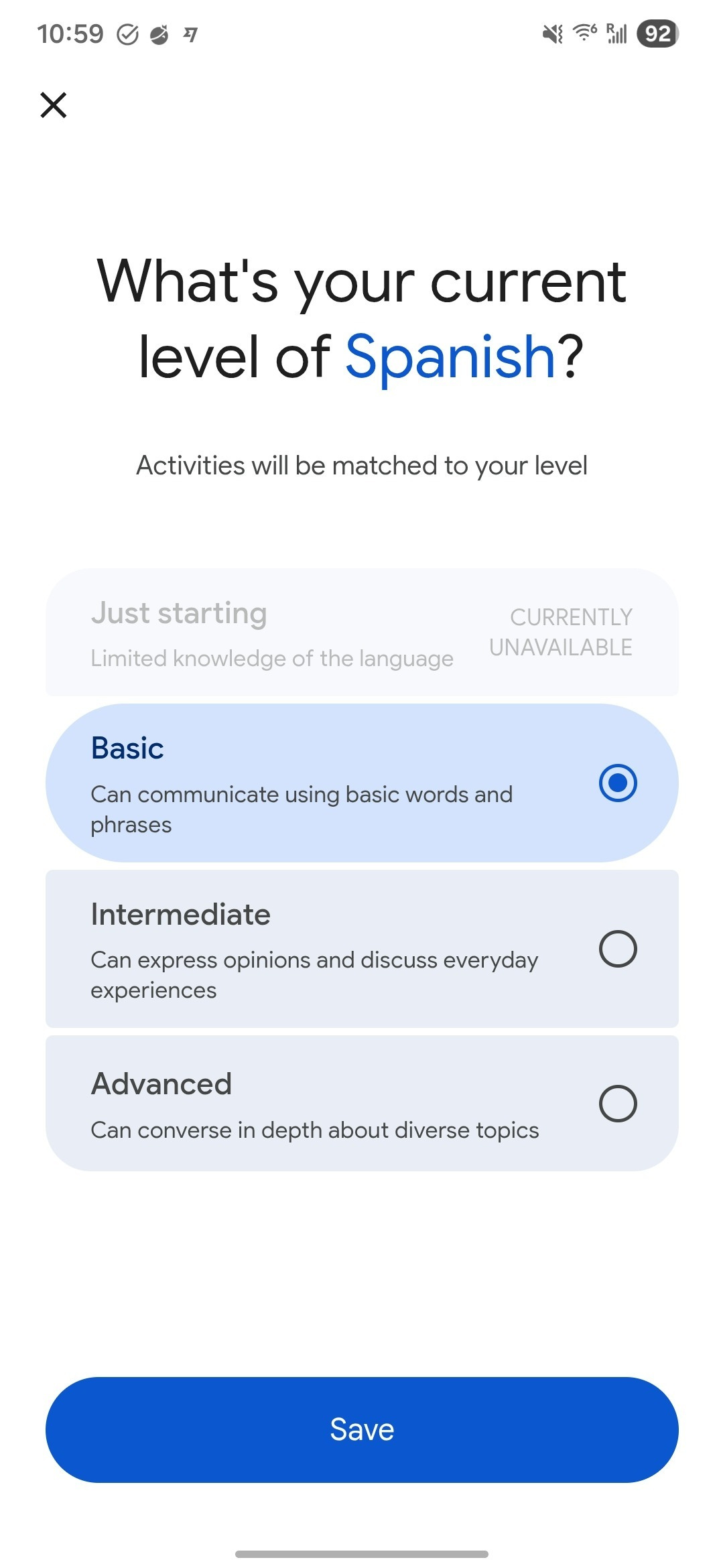 Iām using it to learn Spanish as an English speaker, and I can choose from basic, intermediate, or advanced levels. It appears as though a ājust startingā level will be rolled out at some point.