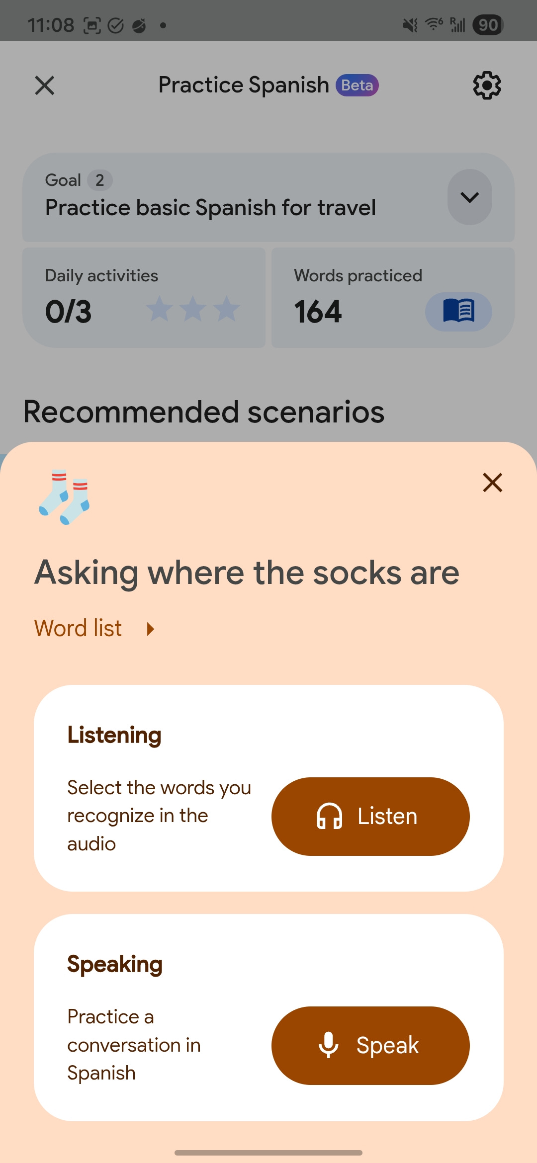 You can also pick a goal or create your own scenario. For my goal, I chose āPractice basic Spanish for travel.ā
